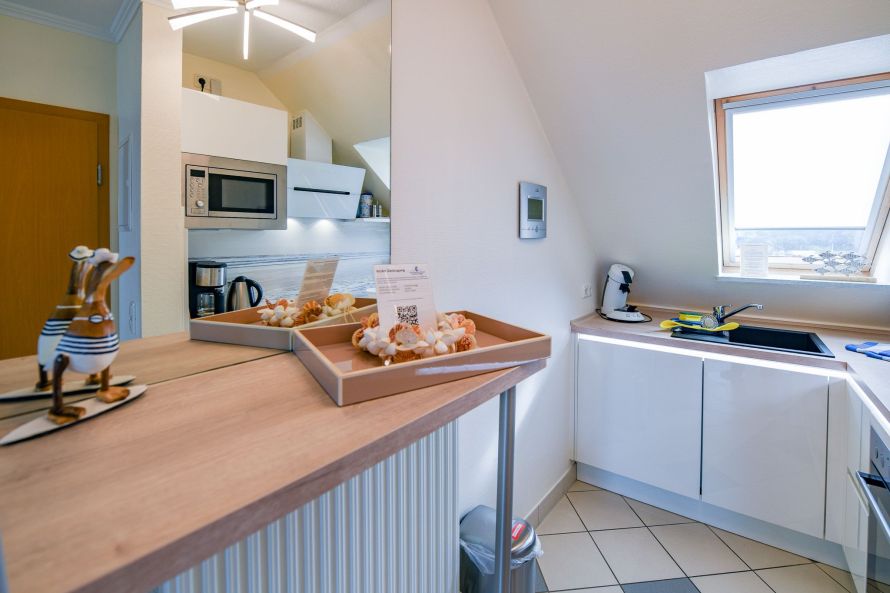 Freuen Sie sich auf einen Westbalkon mit Meerblick und wunderschönen Sonnenuntergängen mit Blick auf die Insel Neuwerk. Der Wohnbereich verfügt über einen Essplatz, zwei Flatscreen-TVs, kostenfreies WLAN sowie eine offene, voll ausgestattete Küchenzeile inklusive Senseo-Kaffeemaschine.